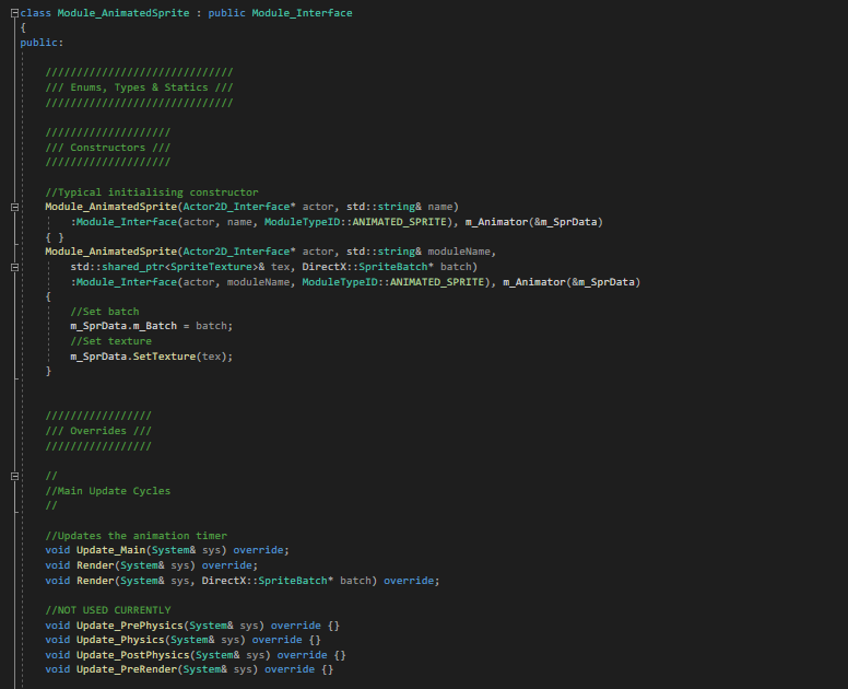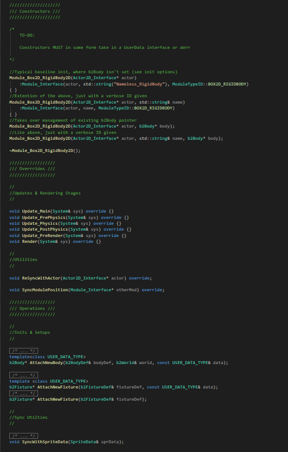 The first major change was implementing a comprehensive module system that was scalable, extendable, and non-intrusive to add to. The idea takes a leaf out of Unreal’s book in how it uses its Component System. Now modules are created out of their own interface class with appropriate virtuals for regular use, alongside additional functions and data to be able to safely cast the modules for specific data access.