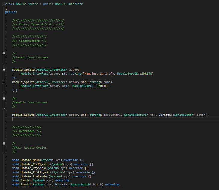 Following on with that inspiration is the Module system (or Components). Exactly like UE, anything that could conceivably be on a game object, will be based out of the base module class. This part certainly needs more cooking, especially in how to manage the hierarchy of module and proper communication between module-to-owner and module-to-module (if even necessary).