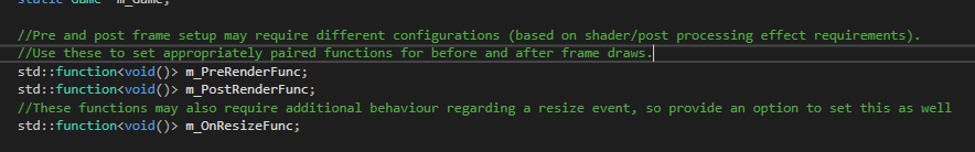First steps on getting around that has been working on a wrapper class to extend some of its behaviour in simple way to get around the limitations, such as using bound functions to modify what happens in the render setup with that particular batch. This opens up setting additional const buffers, alongside setting custom shaders and root signatures in the setup process. I hope for this to enable additional texture options down the line, like normal mapping/blending (pending proper testing).