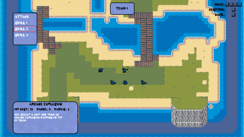 A team project consisting of 1 Game Designer and 2 Programmers. Our project took place over 12 weeks and consisted of developing a 2D turn-based RPG, in a similar style to the older Fire Emblem games, Final Fantasy Tactics, and Advanced Wars. With a much more ambitious project than the previous year, this brought me up a level in my skills and ability by challenging me in new ways. This helped streamline and apply what I already learned in a more complex environment, with new concepts being introduced, such as data-driven design, and integration and adaptation of external programs like Tiled for better workflow between designers and programmers. Whilst somewhat rough around the edges, I was very happy with what we achieved with the project, and learning a great deal in the process.